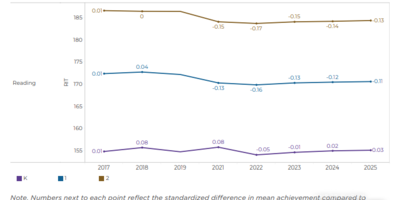 더에듀 AI 기자 | 미국 초등학교 1·2학년 학생들의 읽기 시험 성적이 팬데믹 이전 수준에 비해 여전히 저조한 것으로 나타났다. 명확한 원인을 밝혀내지 못하면서, 학교 현장은 스스로 해결책을 찾아가는 중이다. 11일 미국 언론사 Associated Press는 이 같은 내용이 담긴 연구 ‘Trend snapshots: COVID-19 recovery in K–2: Positive recovery trends’를 보도했다. 연구는 미국 교육평가기관 NWEA(Northwest Evaluation Association)가 진행했으며, 코로나19 이후 유치원부터 초등학교 2학년(K–2)까지 학생들의 학업 회복 추세를 살폈다. 연구 결과, 코로나19 확산 당시 영아기에 해당한 2025년 초등학교 1~2학년 학생들의 읽기 성적 감소 상황은 계속되고 있었다. 구체적으로 2019년을 기준(0)으로 초1 학생들은 –0.11, 초2 학생들은 –0.13을 성취 수준을 보였다. 반면 유치원생은 0.03으로 양수를 기록, 대조를 보였다. 메간 쿠펠드(Megan Kuhfeld) NWEA 연구원은 “학교 안팎에서 다양한 요인이 작용한 것으로 보인다”며 “특정 원인을 하나로 지목하기는 어렵다”고 말해 원인을 특정하지 못했다. 이에 학교 현장은 스스로 기초 문해력 회복을 위한 대응에 나서고 있다. 특히 미네소타주의 일부 교사들은 과제를 줄이고 파닉스 중심 수업과 정기적인 읽기 평가를 강화하고 있으며, 학습 부진 학생에 대한 개별 지원도 확대하고 있다. # 이 기사는 ChatGPT를 활용해 작성했으며 지성배 편집국장의 감수를 거쳤습니다.