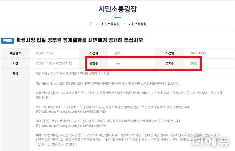청원인은 ▲해당 공무원에 대한 징계 처분 결과와 사유 공개 ▲조사 및 징계 과정 전반에 대한 기록 공개 등을 요구하며 “이 사건에 대한 화성시의 대응은, 화성시가 정의롭고 투명한 도시인가를 판가름하는 분수령이 될 것”이라고 강조했다.(관련기사 참조 : https://www.te.co.kr/news/article.html?no=27288)
