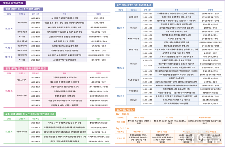 에듀테크 세미나는 ▲AI와 에듀테크로 여는 미래형 수업 ▲함께 배우는 교실, 다문화 포용교육의 길 ▲AI/디지털 기술이 바꾸는 특수교육의 현재와 미래 ▲학교 운영의 혁신, 디지털로 새롭게 총 4개의 주제로 운영된다.