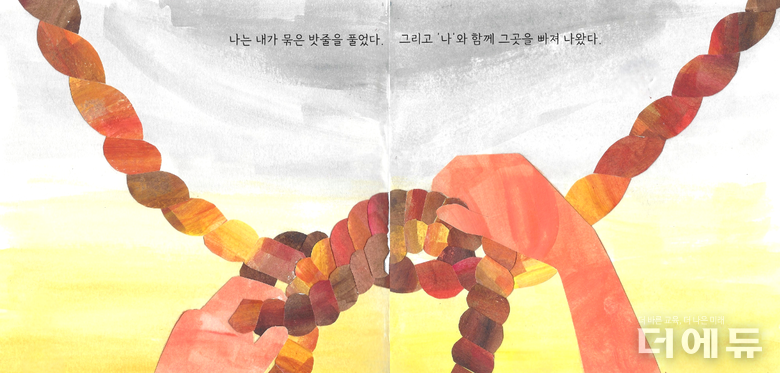 저는 그림책 한 장면 장면마다 작은 이야기를 그림에 담아 그렸어요. 첫 장면에서 보인 밧줄의 색깔은 어둡고 진한 색이에요. 그렇지만 사건이 해결되고 난 후에는 밝고 다채로운 계열로 바뀌어 있죠. 마음의 무게가 가벼워지고 긍정적인 방향으로 나아가는 저를 담아냈어요. 이 장면은 마음속에 따스함이 충족되어 가고 있는 것을 표현했어요.