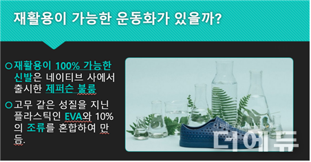 그런데 운동화는 65개 부품으로 구성됐으며 대부분은 재활용이 불가능하고 자연적으로 분해되는 데 최대 1천년이 소요된다. 이러한 사실을 우리는 알고 있을까?