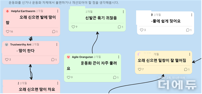 운동화를 신거나 운동화 자체에서 불편하거나 개선할 점을 브레인스토밍했다. 같은 의견의 경우, 화살표로 연결했고, 우리가 공통으로 생각하는 불편한 점을 함께 공유했다.