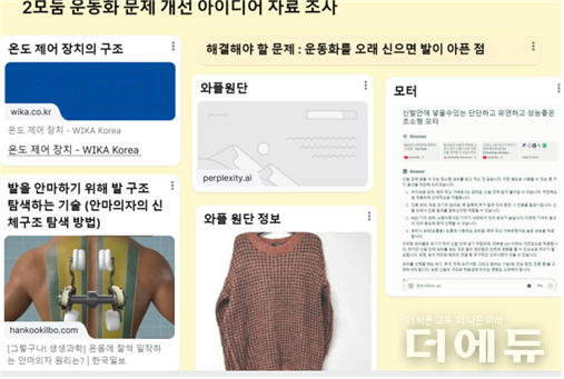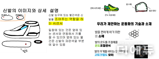 아이들은 개선 아이디어 자료를 조사하는 과정에서 온도 제어 장치, 안마 기술, 원단 정보 등을 알게 되었다. 그리고 ‘친환경성’과 ‘기술성’이라는 두 가지 기준에 부합도록 모둠별로 운동화를 협업하여 디자인했다.