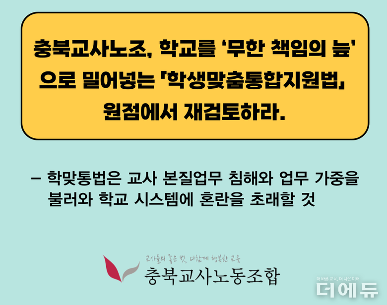 충북교사노조는 “교사가 학생들의 불행을 저울질하고 판단해야 해 민원의 최전선에 서게 될 수밖에 없다”며 “교육 공동체의 신뢰는 무너지고 학교는 갈등의 장으로 변질될 것”이라고 내다봤다.