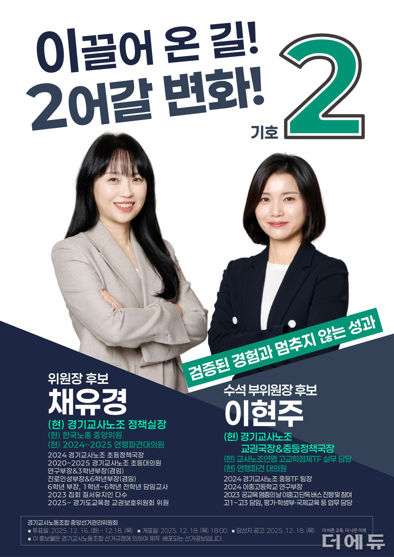 더에듀 지성배 기자 | 경기교사노조 제5대 위원장에 채유경 현 정책실장이 당선됐다. 러닝메이트인 이현주 수석부위원장도 현 교권국장과 중등정책국장을 맡고 있어 조직 운영에 안정성을 더하게 됐다.