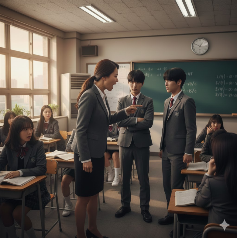 <교무실> 담임은 교무실에서 A와 B로부터 설명을 듣습니다. 설명이 끝난 후 담임은 “너희가 어떤 잘못을 했는지 알지?”라고 말합니다.