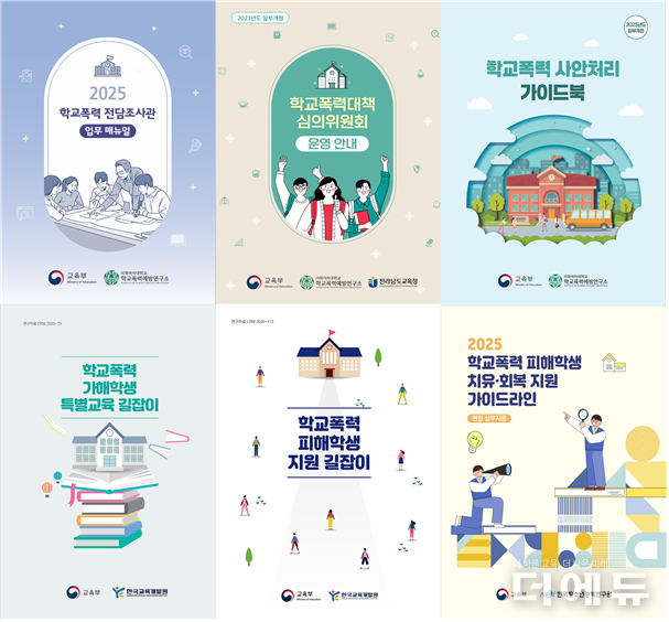 교육부는 학교폭력 전담조사관 업무매뉴얼/ 학교폭력 사안처리 가이드북/ 학교폭력대책심의위원회 운영안내(이화여자대학교 학교폭력예방연구소), 학교폭력 피해학생 지유회복 지원 가이드라인(한국청소년정책연구원), 학교폭력 가해학생 특별교육길잡이/ 학교폭력 피해학생 지원길잡이(한국교육개발원) 등 매뉴얼을 만듭니다.