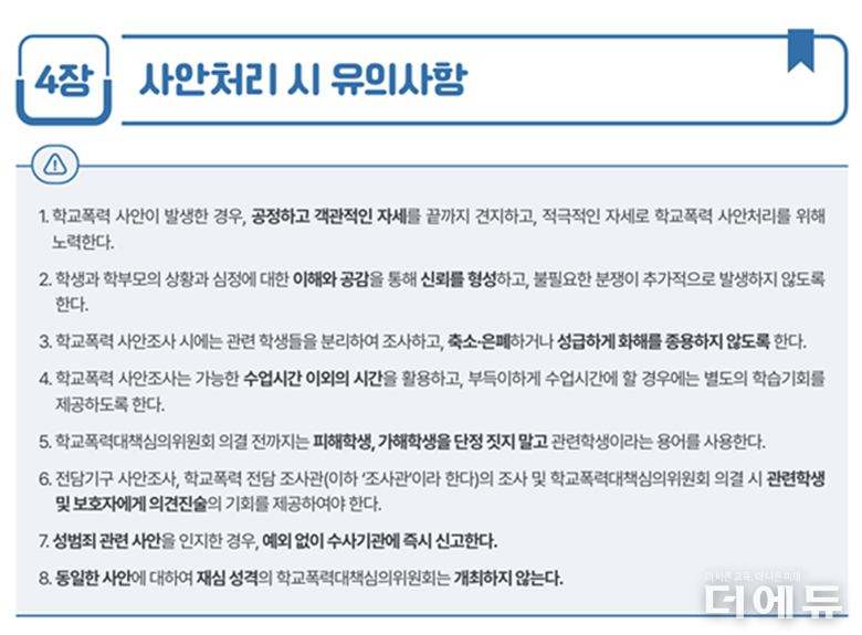 더에듀 | 앞서 ①신고 직후 ‘접수증’, ‘피해학생 권리안내문’, ‘분야별 지원기관 연락처’ 안내와 ②진정한 사과를 가로막는 비밀누설금지 조항의 개정 필요성을 제기했습니다. 이번에는 ③학교폭력 관련 매뉴얼 및 통계 공개의 필요성을 살핍니다.
