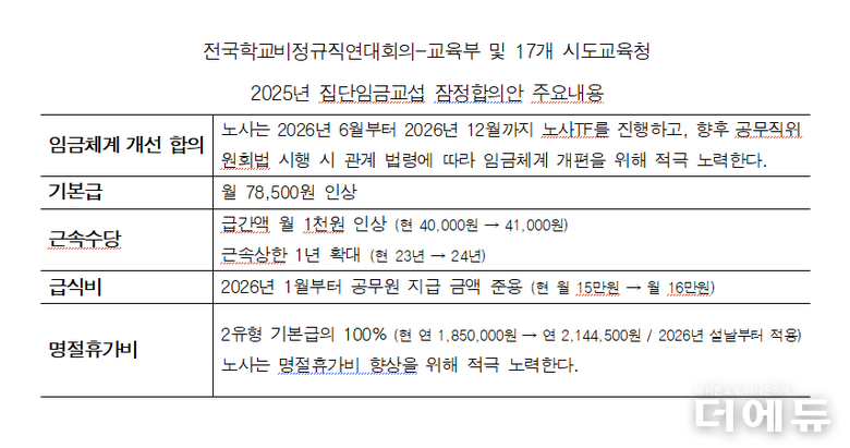 전국학교비정규직연대회의(전국교육공무직본부, 전국여성노조, 전극학교비정규직노조)와 교육부 및 17개 시도교육청은 지난 8일 이 같은 내용의 ‘2025 집단 임금교섭’에 합의했다.