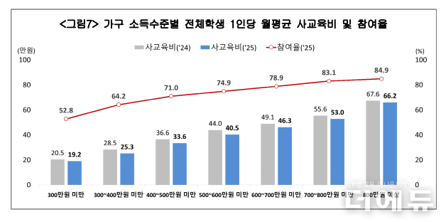 특히 전년 대비 두 집단 모두 사교육비 지출과 참여율 모두 감소했지만 그 비율은 300만원 미만 가구가 더 높았다. 구체적으로 지출은 각각 6.6%, 2.1%, 참여율은 각각 4.6%, 2.6% 감소했다.