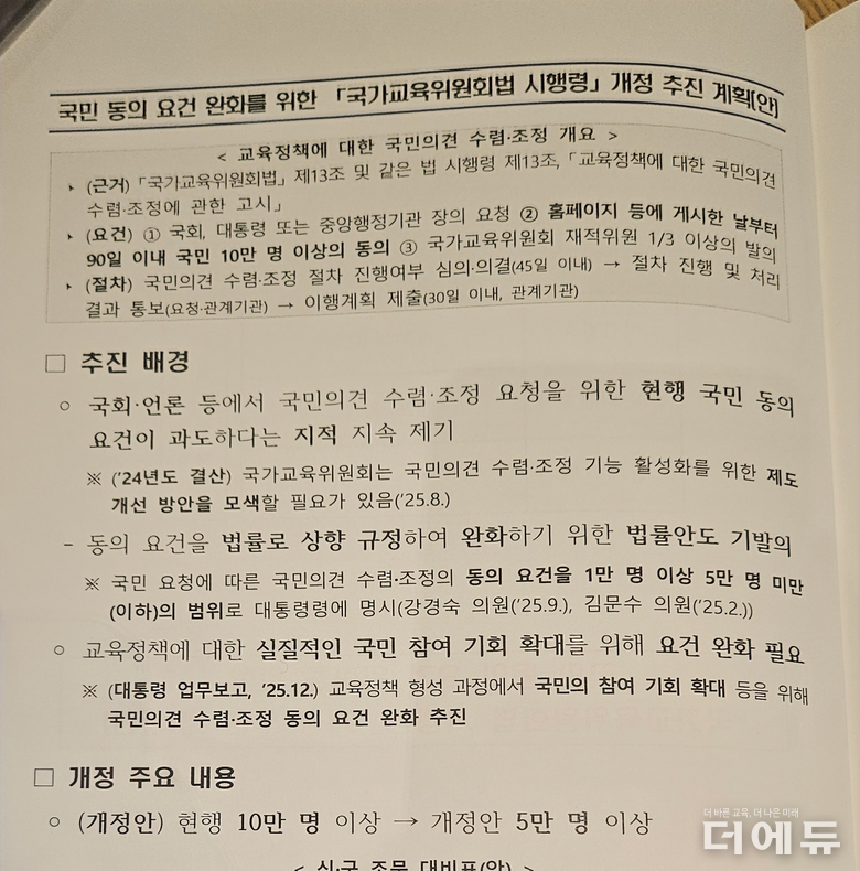김문수 더불어민주당 의원(국회 교육위원회)과 강경숙 조국혁신당 의원(국회 교육위원회)도 지난해 국민 의견 수렴·조정 기능을 활성화해야 한다며 동의 요건을 1만명 이상 5만명 미만으로 조정하는 내용의 법안을 발의하기도 했다.