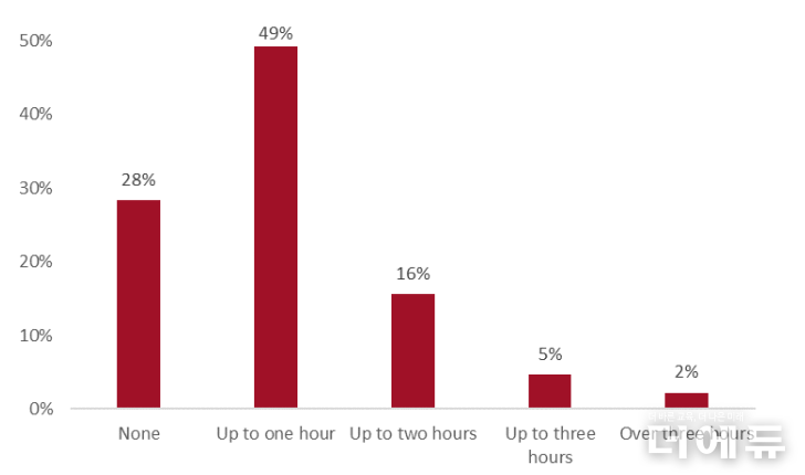 스크린 사용 시간 분포는 하루 1시간 이하가 49%로 가장 많았으며, 전혀 사용하지 않는 경우가 28%로 뒤를 이었다. 2시간 이하 16%, 3시간 이하 5% 순이었으며, 전체의 2%는 하루 3시간 이상 스크린을 사용하는 것으로 확인됐다.