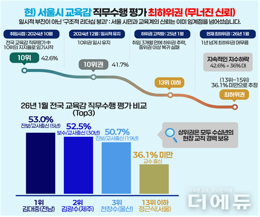 정근식 서울교육감은 임기를 시작한 지난 2024년 10월 10위로 시작했다. 지난해에는 3월과 4월에만 10위에 이름을 올렸을 뿐 이름이 보이지 않는다. 즉 지난해 12개월 중 10개월은 13윌 이하의 성적표를 받은 것.