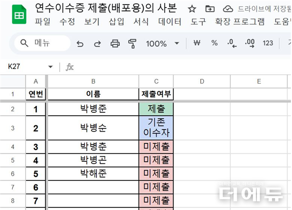 이에 박 총괄리더는 직무연수별 이수증 제출 구분이 가능하도록 만들었으며. 특히 기존 이수자들의 경우에도 기존 이수로 별도 분리하는 기능도 구현해 수합자가 더욱 편리하게 활용할 수 있게 했다.