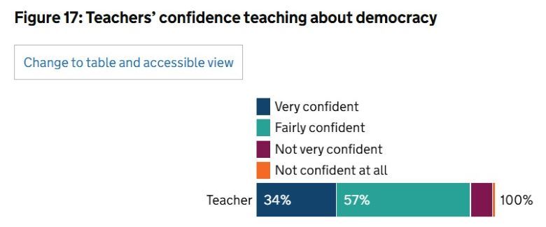 중등 교사의 64%는 민주시민 교육을 한 적이 있었다. 운영 방식은 관계·성·건강 교육(Relationships, Sex and Health Education, RHSE) 시간이나 개인·사회·건강·경제 교육(Personal, Social, Health and Economic Education, PHSE)을 통해 이뤄지는 경우가 66%로 가장 많았다.