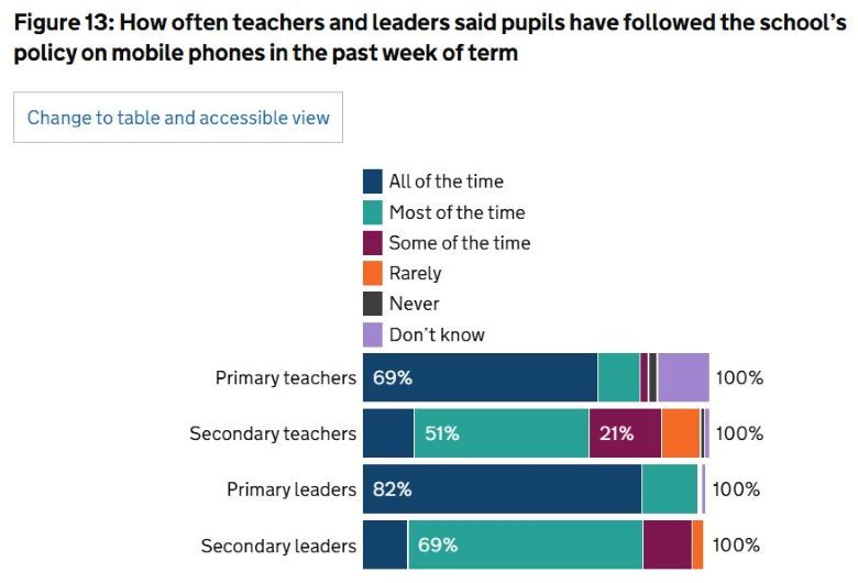 조사 결과에 따르면 직전 한 주 동안 학생들이 얼마나 휴대전화 관련 학교 규칙을 준수했는지에 대해 초등 교사 81%(항상 69%, 대부분의 시간 12%)가 그렇다고 응답했다. 중등 교사는 66%가 그렇다고 응답했지만, 항상 그렇다는 응답은 15%에 그쳤고, 대부분 그렇다는 응답이 51%였다.