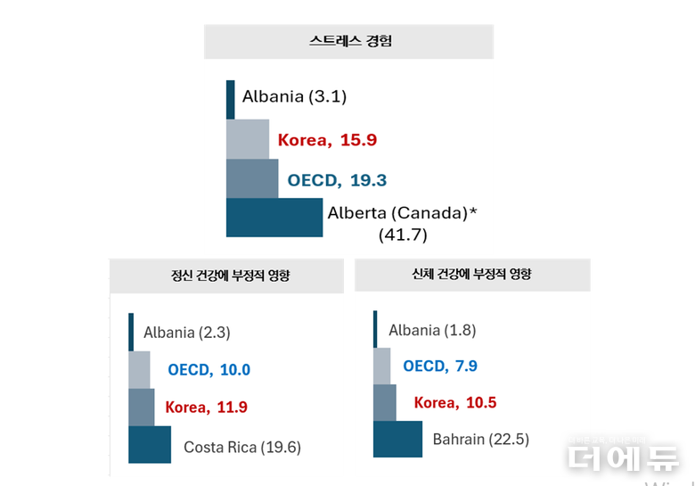 스트레스와 업무 시간, 직무 등 만족도를 묻는 교직 환경 분야를 살펴본 결과, 한국 교사들 중 업무 스트레스를 ‘아주 많이 받는다’고 응답한 비율은 15.9%였다. 이는 OECD 평균 19.3% 보다 낮은 수치였으나, 정신(한국 11.9%/ OECD 10.0%)과 신체(10.5%/ 7.9%)에 부정적 영향을 경험한 교사 비율은 더 높았다.