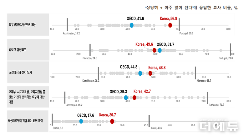 다음으로는 ▲과도한 행정업무 46.9%(OECD 51.7%) ▲교실에서의 질서 유지 48.8%(OECD 44.8%) ▲외부 행정기관(교육부, 교육(지원)청 등)의 요구 대응 42.7%(OECD 39.3%) ▲학생으로부터 위협 또는 언어 폭력 31.2%(OECD 17.6%) 순이었다.