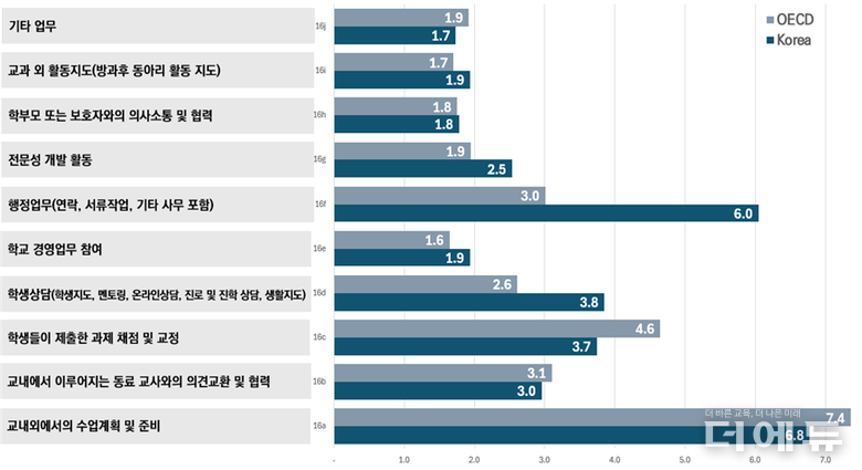 구체적으로 한국 교사들은 수업 시간을 제외하고 ▲수업 계획 및 준비(6.8시간) ▲행정 업무(6.0시간) ▲학생 상담(3.8시간) ▲학생 과제 채점 및 교정(3.7시간)에 많은 시간을 사용하고 있었다. OECD 평균의 경우 ▲수업 계획 및 준비(7.4시간) ▲학생 과제 채점 및 교정(4.6시간) ▲동료교사와의 협력(3.1시간) 순이었다.