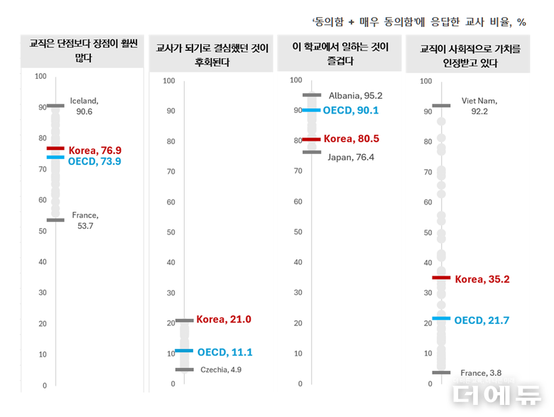 교사의 행정 업무 관련 시간이 늘어서인지, 교사가 된 것을 후회하는 비율은 21%로 조사 대상국 중 가장 높은 비율을 보였다. 다만, 교직을 단점보다 장점이 많은 직업으로 생각하는 비율은 76.9%로 OECD 평균 73.9%보다 높았다.