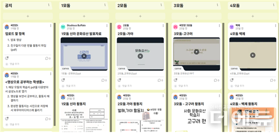 5단계는 문화유산 해설 영상을 보고 학습지를 푸는 단계이다. ‘온라인 문화유산 클래스’에 접속하여 각 모둠의 영상을 시청하고, 친구들이 만든 활동지를 풀었다. 학생들은 온라인 공간에서 서로의 콘텐츠를 보며 자연스럽게 학습을 이어갔고, 질문과 감상을 댓글로 남기며 상호 피드백을 주고받았다.