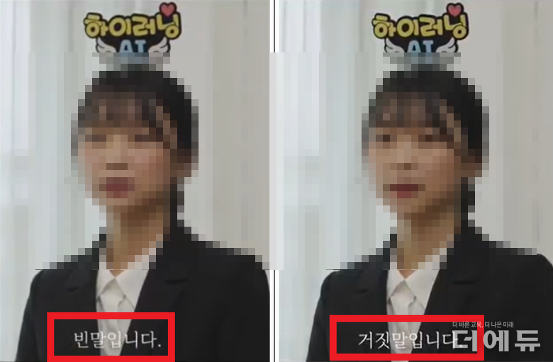 또 영상 말미에 등장하는 교사의 학생 독려말에 AI는 “빈말입니다, 진심이 담겨있지 않았습니다”라고 평가했으며, 더 궁금한 사안이 있으면 회의가 있으니 쉬는 시간 말고 점심시간에 찾아오라는 말에는 “거짓말입니다. 화장실 이용 시간으로 예상 소요 시간 20분”이라고 거드는 것도 문제로 지적됐다.