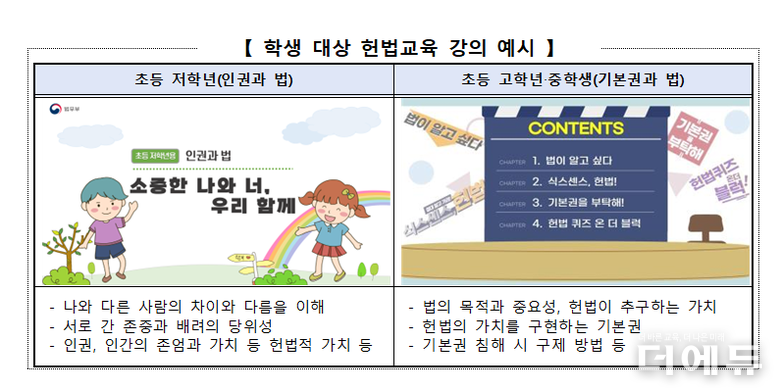 법무부 소속 헌법 전문강사가 교과 및 창의적 체험활동 시간을 활용해 헌법이 추구하는 가치, 인권 및 기본권, 법의 역할 등을 학생들이 이해하고 체험할 수 있도록 강의한다. 2026년에는 대상 학교급을 고등학교까지 확대할 예정이다.