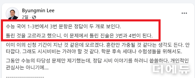 더에듀 지성배 기자 | 올해 대학수학능력시험(수능) 국어영영 1~3번 지문에 문제를 제기한 이병민 서울대 영어교육과 교수가 3번 문항의 정답이 두 개로 보인다며 문제를 제기하고 나섰다.