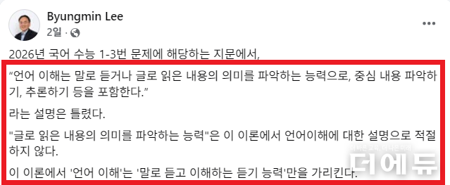 앞서 그는 자신의 SNS에 “언어이해는 말로 듣거나 글로 읽은 내용의 의미를 파악하는 능력으로 중심 내용 파악하기, 추론하기 등을 포함한다고 설명하고 있다”며 “’글로 읽은 내용의 의미를 파악하는 능력‘은 이 이론에 대한 설명으로 틀린 내용”이라고 문제를 제기했다.