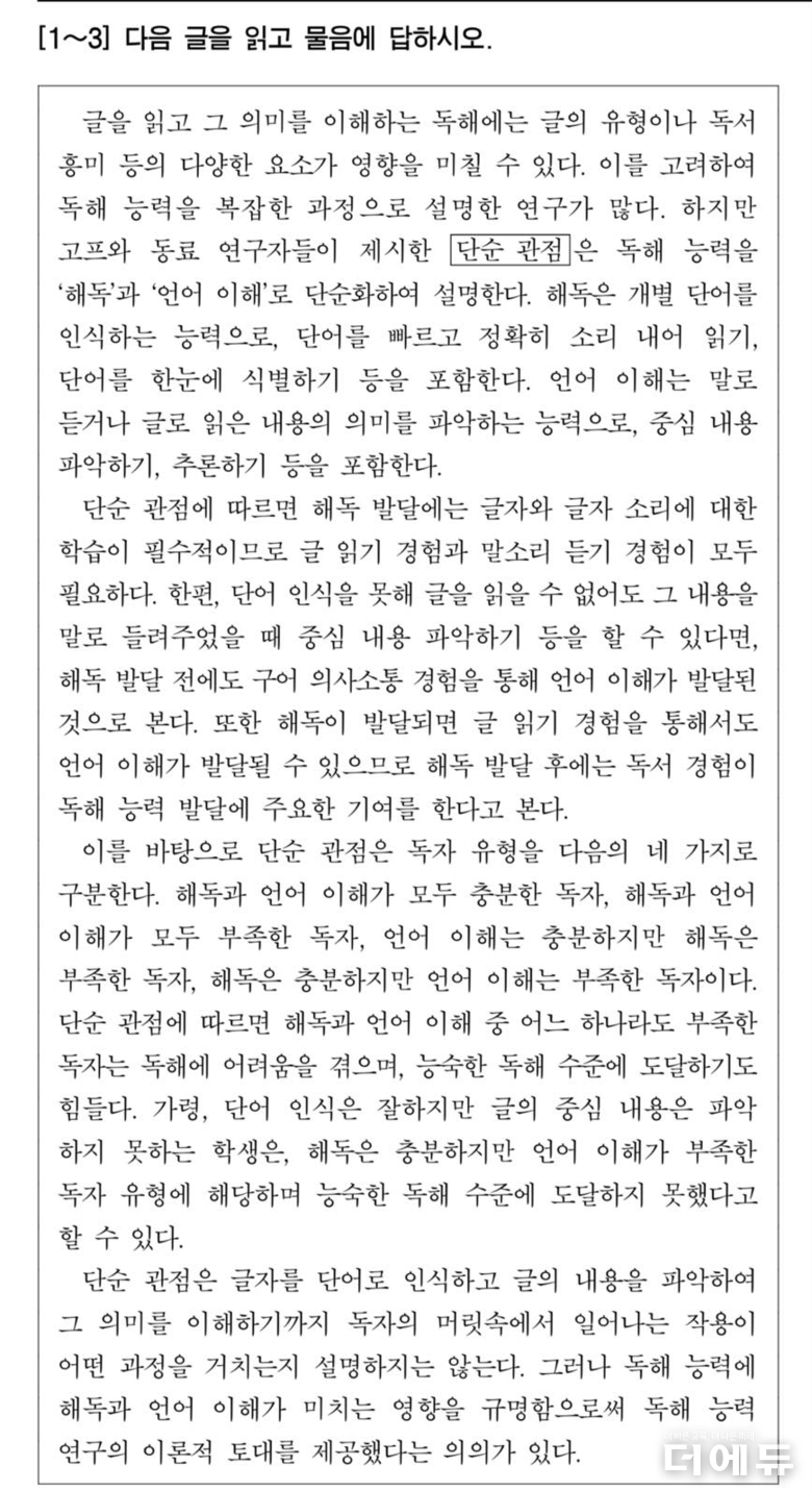 이 교수에 따르면 국어 3번 문항은 갑이 실시한 단순 견해 실험에 대한 내용으로, 연구 대상인 A학생은 해독은 잘 되는데, 듣기나 읽기 독해가 안 되고, B학생은 글자 해독이 안 돼 독해가 안 되나 듣기 이해는 잘 된다.