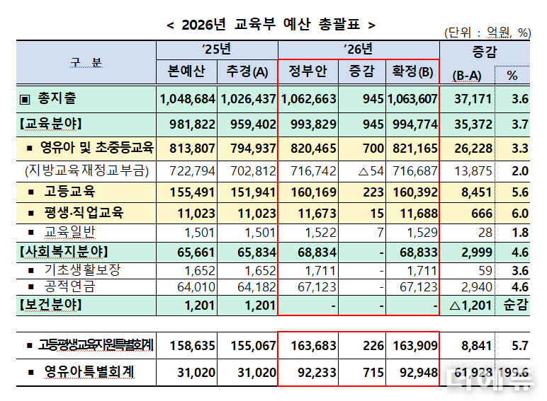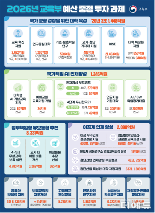 더에듀 전영진 기자 | 내년도 교육 예산은 106조 3607억원으로 확정됐다. ▲국가 균형 성장을 위한 대학 육성 ▲인공지능(AI) 디지털시대 미래인재 양성 ▲정부책임형 유보통합 추진 등 국정과제 이행을 위한 예산이 중심으로 편성됐다.