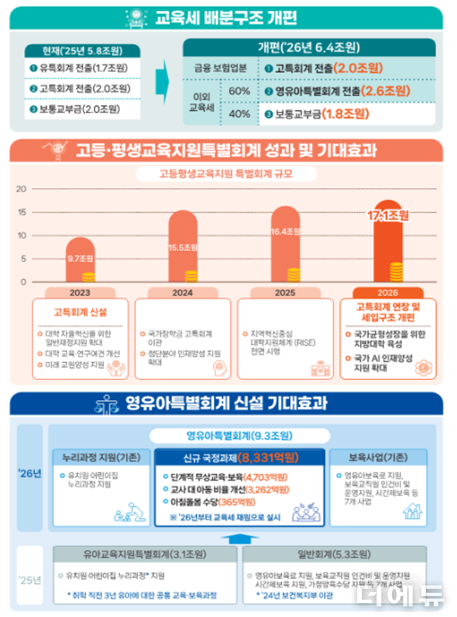 이밖에 고등·평생교육지원특별회계 16조 4000억원(9000억원 증가), 영유아특별회계 9조 3000억원(6조 2000억원 증가)이 포함됐다.