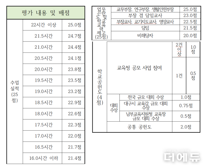 대다수 학교가 대동소이하다고 들었습니다. 수업실적은 1시간당 0.7점의 차이가 발생합니다. 보직교사는 담임교사보다도 3.5점 높습니다. 수업 시간과 비교하면 주당 6시간 차이와 비슷합니다.