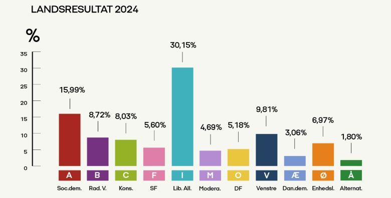 이 때문에 선거 결과도 실제 선거와 상당한 차이가 나기도 한다. 예를 들어, 2024년에는 자유연대가 30.15%를 득표했고, 이어 사회민주당(15.99%), 좌파당(9.81%), 사회자유당(8.97%), 보수당(8.03%) 순이었지만, 당시 의석수는 사민당(27.9%), 좌파당(12.8%), 덴마크민주당(8.9%), 녹색좌파당(8.4%), 자유연대(8.4%) 순이었다.