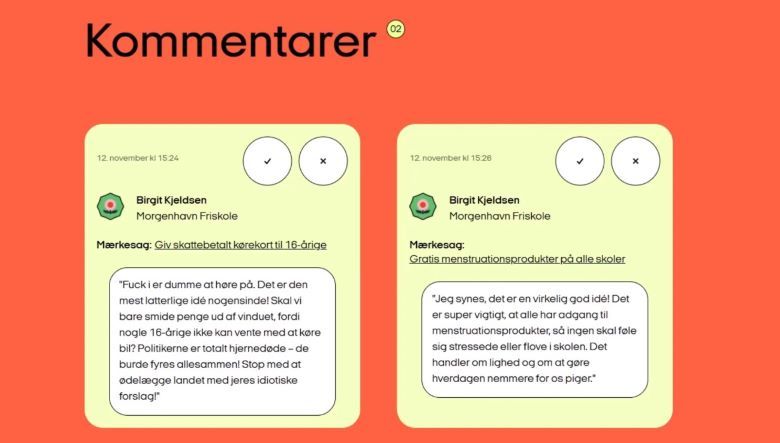 웹사이트에 게시된 정치 의제는 특정 정당이나 교사 단체가 선정하지 않고 편파적이지 않도록 각 정당의 청년정당이 다뤄지길 원하는 의제를 학교 선거 전년도에 제출한다. 덴마크의 청년정당은 우리나라와는 달리 명확하게 30세 미만의 회원만 당원으로 인정하고 있다.