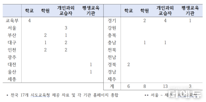 적발된 기관 유형은 개인과외교습자 13명, 학원 8명, 학교 6명, 평생교육기관 3명으로 개인과외교습자가 가장 많았다.