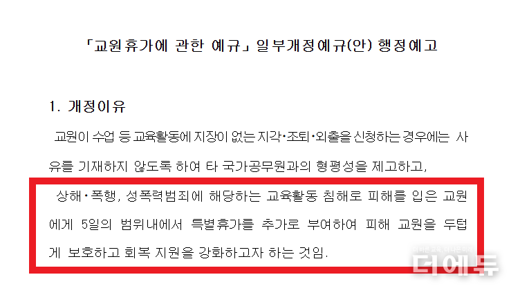 교육부는 지난 4일 ‘교원휴가에 관한 예규’ 개정안을 행정예고했다.