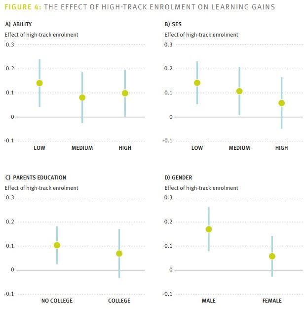 그 결과, 진학 계열 취학이 표준편차 0.11 만큼 표준화 평가 성적을 향상시켰다. 특히 수학 교과에서, 저소득층, 저역량, 저학력 부모, 남학생의 경우에 효과가 컸다.