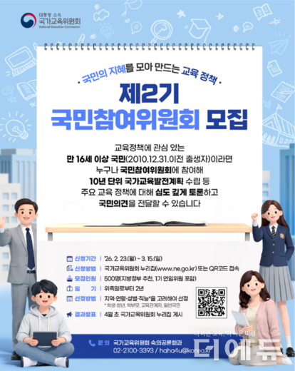 국가교육위원회(국교위)가 내달 15일까지 제2기 국민참여위원 300명 이상을 공개 모집한다고 23일 밝혔다. 참여 자격은 교육정책에 관심이 있으며, 적극적으로 참여할 의사가 있는 만 16세 이상 대한민국 국민이다. 최종 선정자는 4월 초 국교위 홈페이지를 통해 발표한다.