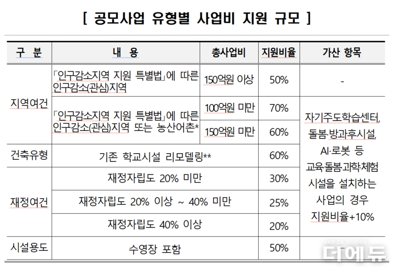 국정과제에 해당하는 ‘지역교육 혁신을 통한 지역인재 양성’ 추진을 위해 인구감소(관심)지역 및 농산어촌에는 사업비 70%를 지원하며, 자기주도학습센터, 돌봄·방과후 시설, 인공지능(AI)·로봇 등 교육·돌봄·과학·체험시설을 설치하는 사업에는 10%를 가산한다.