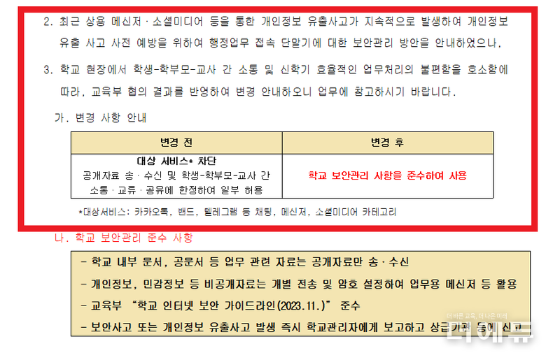 핵심은 상용 메신저·소셜미디어 등을 통한 개인정보 유출사고 지속 발생으로 개인정보 유출 사고 사전 예방을 위해 학교 업무PC에서 해당 프로그램의 차단 조치를 해제한다는 것이다.