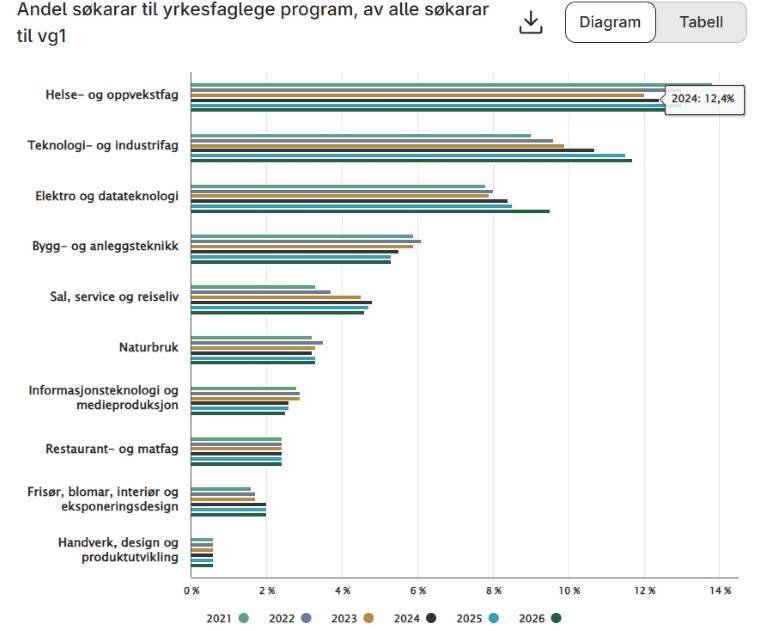 보건·유아교육 도제식 일자리 지원자 감소는 노르웨이의 고교 직업 계열의 진로 경로의 다양성 때문이다. 2학년을 마치고 도제식 일자리에 지원하는 것이 보통이지만, 대학 진한 자격 취득을 위해 추가적인 학점을 수강하기 위해 학업 연장을 신청하는 경로도 있는데, 최근 보건·유아교육 전공 학생 중 48%가 진학을 위한 학업 연장을 신청했다.