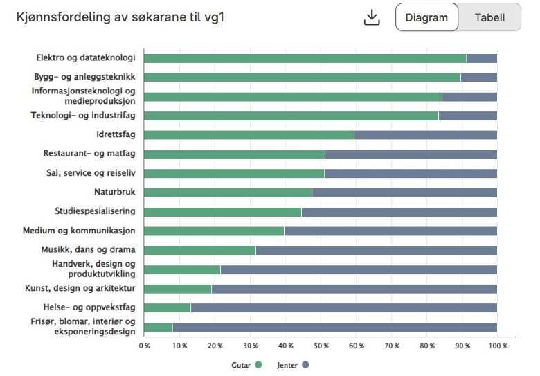 7개 주에서는 보건·유아교육이 가장 인기 있는 전공이었고, 8개 주에서는 기술·산업이 가장 많았다. 핀마르크주에서는 심지어 일반계보다도 비율이 높았다. 모든 주에서 남학생의 직업계 선택 비율이 높았다. 남녀 차이가 모두 10%p 넘게 났다.