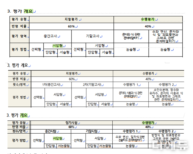 위에 제시된 ‘3.평가개요’를 보라. ‘지필평가’는 ‘정기시험’으로, ‘1차(중간고사)는 중간시험’으로, ‘2차(기말고사)는 기말시험’으로 바뀌었다.