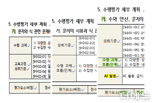 ‘5.수행평가 세부 계획’도 셀을 넣었다 뺐다. 위아래 셀의 차례를 바꾼다. ‘교육과정성취기준’을 ‘성취기준’으로 ‘수행과제’를 ‘수행과제흐름(단계)’로. ‘AI활용’은 추가됐다.