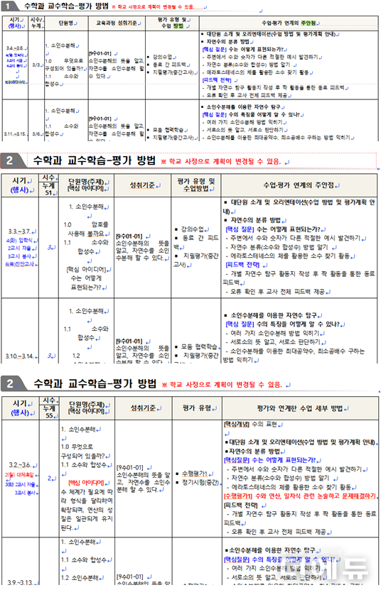 평가 유형, 반영 비율, 횟수·영역, 평가 방법. 수행평가 세부 계획의 성취기준, 수행 과제, 흐름(단계), 평가요소(배점). 이 구조는 3년이 지나도 바뀌지 않았다. 그러나 차례를 바꾸어 일을 시킨다. 문서편집을 교사의 주업무로 만들 의도인가?