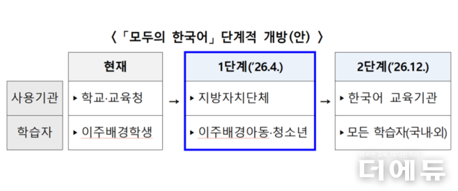 더에듀 김연재 기자 | 교육부와 한국교육학술정보원이 ‘모두의 한국어’ 사용기관과 학습자 범위를 단계적으로 확대한다. 오는 9일부터는 학교 밖 이주 배경 아동·청소년, 성인들을 대상으로, 연말에는 국내외 모든 학습자를 대상으로 프로그램을 개방할 계획이다.