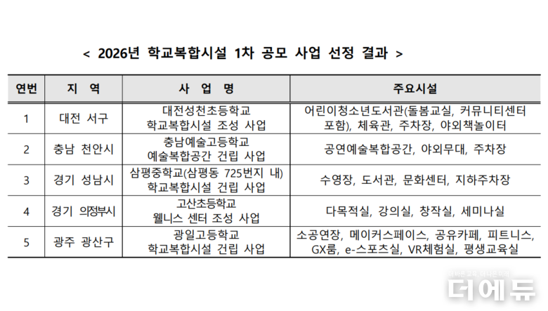 더에듀 김연재 기자 | 교육부가 2026년 학교복합시설 1차 공모 사업 선정 결과를 발표했다. 이번 1차 공모에는 4개 교육청이 신청한 5개 사업이 모두 선정됐다.