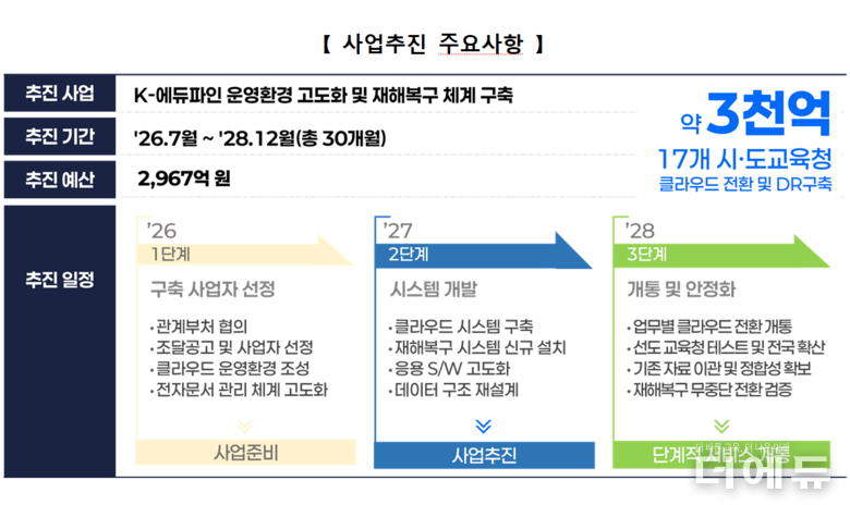 교육부는 오는 2028년까지 교육부·시도교육청·한국교육학술정보원(KERIS)이 참여하는 특별 전담 조직(T/F)을 중심으로 총사업비 2967억 원 규모의 K-에듀파인 재해복구 체계 구축 및 운영환경 고도화를 추진한다고 14일 밝혔다.