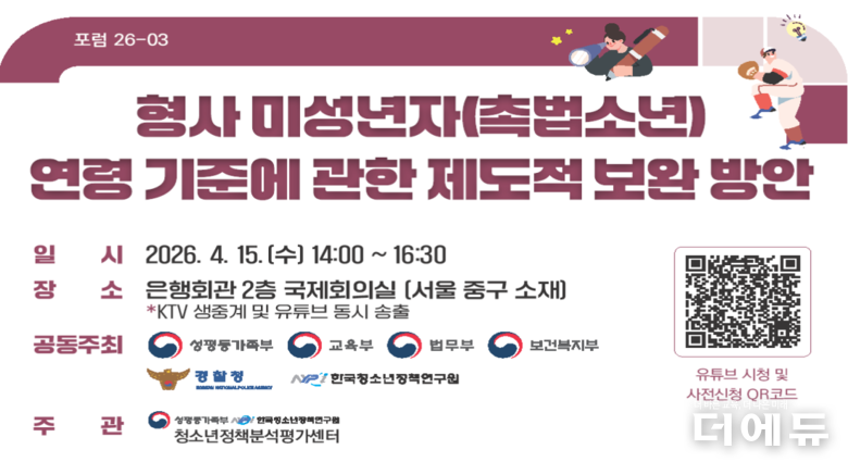 교육부, 성평등가족부, 법무부, 보건복지부, 경찰청, 한국청소년정책연구원이 15일 2시 서울 은행회관에서 ‘형사미성년자(촉법소년) 연령 기준에 관한 제도적 보완 방안’을 주제로 제2차 포럼을 연다. 포럼은 KTV 생중계 및 유튜브 동시 송출될 예정이다.